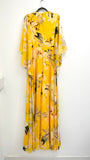 Beautiful long dress that is perfect for weddings and other festive occasions. The dress has three-quarter length chiffon sleeves and a v-neck, as well as an incredibly beautiful fall.