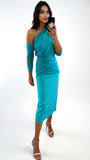 Introducing the exquisite Phyllis Dress, crafted with fabulous cold shoulder design and clever rouching tummy panel which is so flattering. This midi-length occasion dress exudes sophistication and grace, perfect for any special event. Elevate your style with this luxurious piece.