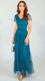 This stunning long dress in tulle finished with v neckline and sheer capped sleeves will take your breathe away with it's tiered Maxi skirt with flounces. Concealed zip to back.