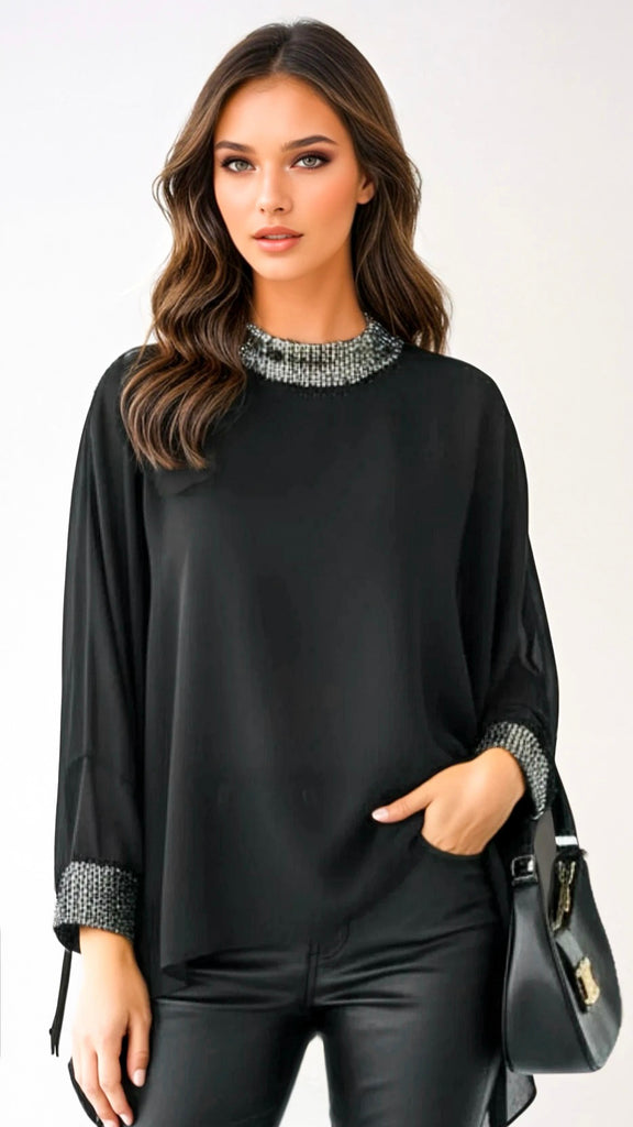 • A2781 Black Sequin Trim Floaty Top