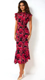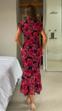 This dress is the epitome of statement dressing! Crafted in a bold pink print and decorated with elegant frills around the neck and arms, this dress is a perfect addition to your summer wardrobe. The a-symmetrical skirt and deep frill along the hem adds a touch of femininity to an otherwise simple silhouette. Pair with flats or heels for the perfect day to night dress