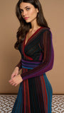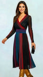 Long dress with V-neck and long sleeves. Fitted waist. Skirt with flare. Stretch fabric.