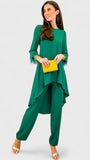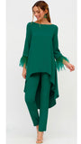 Introducing the exquisite Evalo Dress, crafted with a fabulous feather trim to the sleeves and a floaty dip hem top. This trouser set exudes sophistication and grace, perfect for any special event. Elevate your style with this luxurious piece.
