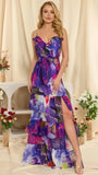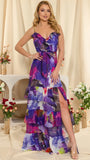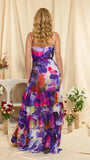 Sleeveless floral tiered maxi dress with v neckline, adjustable straps, right leg slits and elastic waist.
