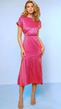 Midi dress in satin with round neck and short sleeves. Fitted waist. Animal print print. Back closure with zip hidden seam.