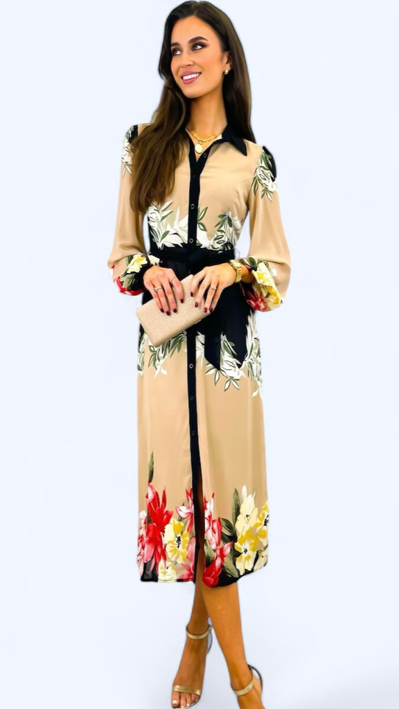 This stunning dress features a unique contrast placket detail and a charming floral print, making it the perfect piece for any occasion.