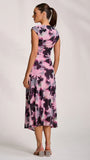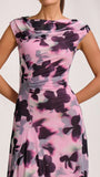 gathering at the shoulder. This sleeveless design is accented by a delicate frill that starts at the waist and cascades down to the hem, creating a graceful, flowing silhouette.