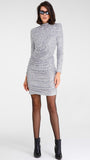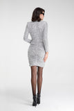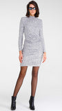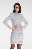 Stretch sequin sheath dress, REF: FRELL. This “party wear” dress is made of silver sequins on a stretch jersey base, offering a snug and comfortable fit. The design features a high neck and long sleeves, perfect for a sophisticated and elegant look. The silhouette is enriched by a gathered waist, which accentuates the shape and adds a touch of unique style. Ideal for evenings and special occasions, this dress is guaranteed to catch attention and shine at any event