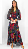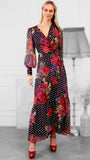 Discover your favourite Hope & Ivy wrap in a brand-new, transitional maxi dress. Featuring our signature tie waist and hand-painted red botanicals scattered across a black and white spotted base, The Moni is an ultra chic choice that's ideal for weddings, parties, and special occasions. Complete with full length blouson sleeves and elevated cuffs, she's a guaranteed seasonal showstopper.