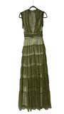 This stunning long dress in tulle finished with rouches on the neck and armholes with deep drop on the front neckline will take your breathe away with it's tiered Maxi skirt with flounces. Concealed zip to back.
