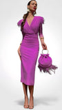 Introducing the exquisite Palma Dress, crafted with fabulous feather trim shoulders and clever rouching tummy panel which is so flattering. This midi-length occasion dress exudes sophistication and grace, perfect for any special event. Elevate your style with this luxurious piece.